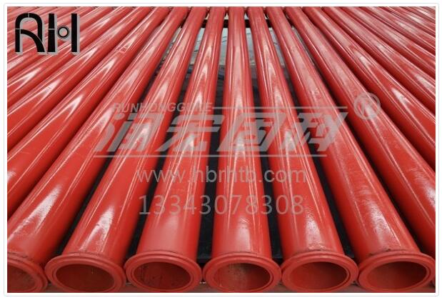 地泵直管,型號(hào)有DN80(管體口徑為89mm)、DN100(管體口徑為108mm)、DN125(管體口徑為133mm或140mm)、DN150(管體外徑為168)。DN80和DN100通常用于砂漿泵,稱為砂漿泵管或泥漿泵管。DN125也就是最常用的混凝土泵管了,一般這個(gè)型號(hào)為低壓泵管,它的管體外徑為133mm,管體厚度為4.5-5mm,焊接采用25mm套裝法蘭自動(dòng)焊接。普通地泵管用于標(biāo)準(zhǔn)壓力內(nèi)的地泵混凝土輸送,如低層混凝土澆筑。而外徑140mm的就是高壓或超高壓地泵管,高壓壁厚是6mm,超高壓壁厚是8或10mm,法蘭是175mm或194mm平口法蘭和字母口法蘭。低壓地泵管潤宏采用焊接148mm的套裝法蘭從而大大提高了法蘭連接部位的抗磨壽命。DN150為超高壓地泵管,管體外徑為168mm,壁厚為12mm,法蘭是230和306雙法蘭設(shè)計(jì),使壓力值達(dá)到最高的前提下保證施工安全。高壓或超高壓的地泵混凝土輸送,用于高層混凝土的輸送,如高速公里、高速鐵路、高樓層、高架橋墩、橋梁等教高建筑物。 因輸送壓力較大,對(duì)管體口徑、壁厚和法蘭的要求較高,所以根據(jù)輸送壓力標(biāo)準(zhǔn)選用合適的管體和法蘭和工藝才能保證工程的安全性。地泵管長度最常用的有0.3米、0.5米、1米、2米、3米(如有特殊要求也可定制)。而潤宏的產(chǎn)品在幾何尺寸方面能夠保證長度誤差小于2mm,法蘭和管體同心度誤差小于0.25mm,法蘭平行度小于2mm。漆面采用環(huán)氧樹脂底漆、環(huán)氧樹脂面漆2遍涂層,漆面硬度、厚度均達(dá)到國際標(biāo)準(zhǔn)。也可按國際標(biāo)準(zhǔn)或特殊要求定做。